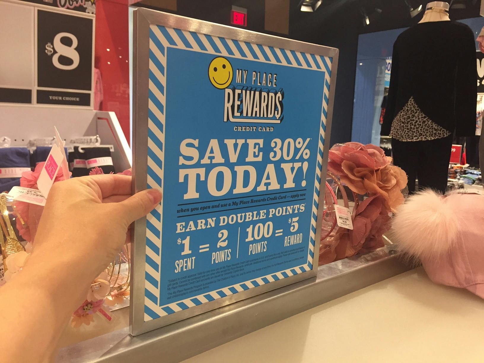 My place rewards credit card coupon. My place rewards credit card. 30% off with my place rewards credit card. Apply for the children's place my place rewards credit card and get a 30% discount on your first credit card purchase, 25% discount on your kids' birthdays, 20% off when you get the credit card, double points, cash rewards, and more.
